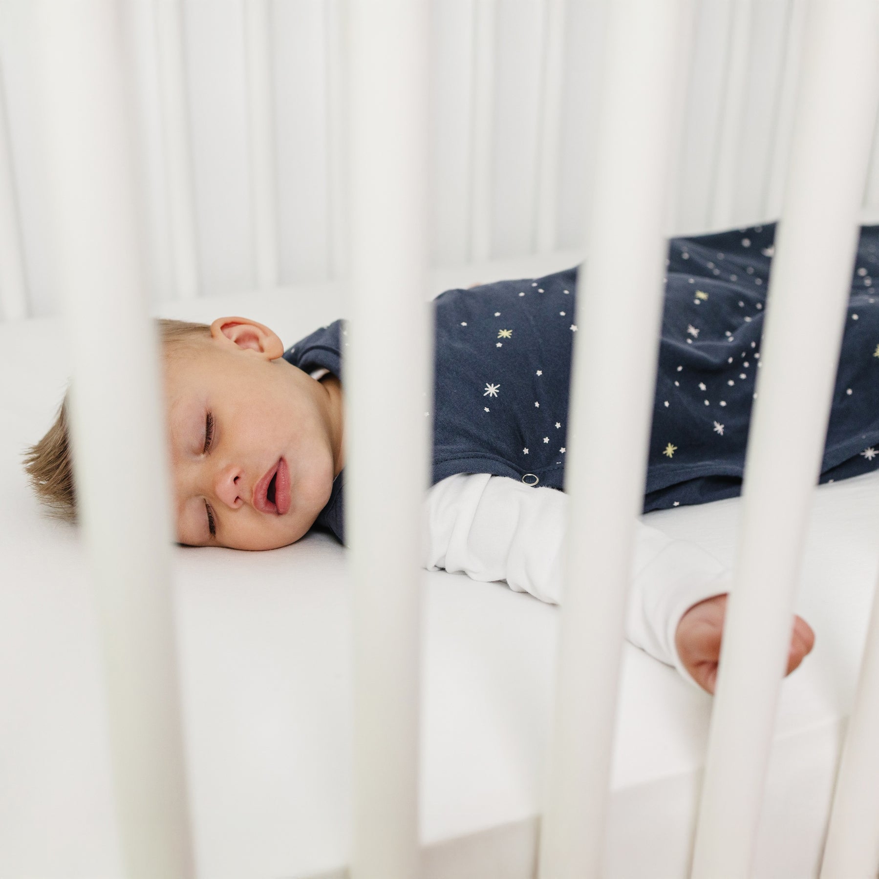 Child sleeping in a crib with white bedding and a star-patterned Ecolino Sleep Sack.